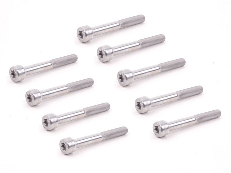 Complete Genuine BMW kit of crankshaft sprocket bolts M6x1.00x50mm-8.8. Includes nine self-locking bolts required to properly secure the crankshaft sprocket during engine service or repair. These bolts are single-use and must be replaced whenever removed. Commonly used in high-performance applications such as BMW S85 V10 engines during clutch and flywheel replacement, including SMG 3-clutch kit service.